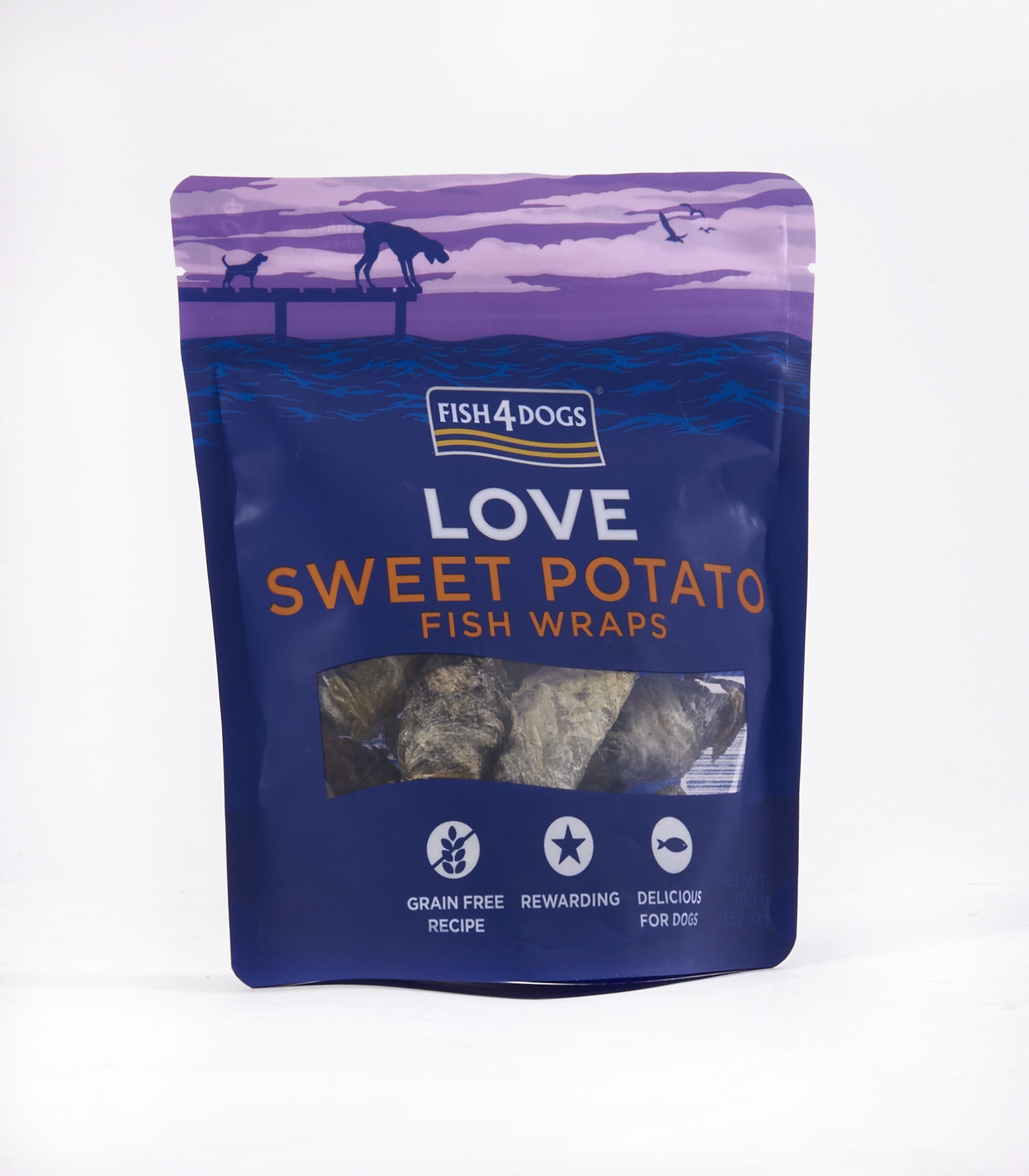 Gjord på sötpotatis inlindad i fiskskinn. Sötpotatis är en fantastisk grönsak som är kalorisnål (i genomsnitt 7 kalorier per godbit) och rik på kalium och vitamin A. Sötpotatis är det perfekta tillbehöret till fisk och blir hälsosamma, läckra godsaker som du kan ge med gott samvete.