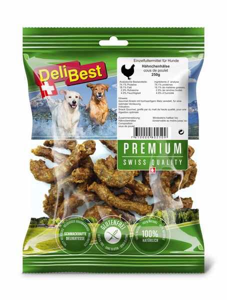 A fine snack for small and medium dogs with some meat and bones as a source of calcium. A gentle drying method ensures that valuable trace elements are retained. Heat treated at 95 ° C. Composition: 100 % swiss chicken necks Analytical components: 62.1% crude protein, 25.8% crude fat, 4.8% raw ash, 7.3% moisture · Average values: the product is subjected to natural fluctuations. Feeding recommendation: At any time between meals as a treat and dental care. Reduce the complete feed accordingly.