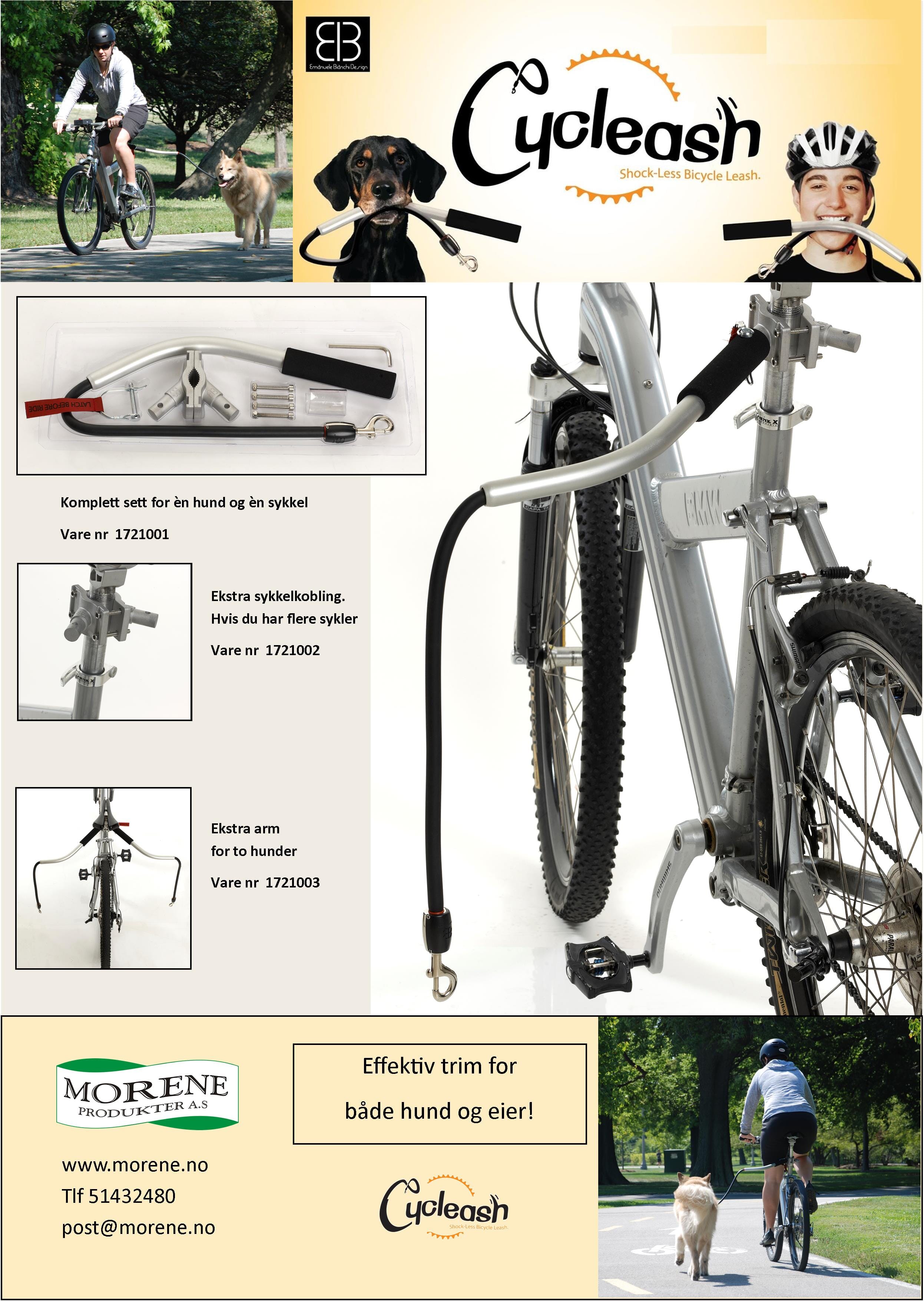 CYCLEASH er kanskje den beste hundelufteren for sykkel som finnes. Den er smart designet og motvirker effektift kraftige rykk og napp fra hunden mens du sykler. Cycleash gir deg hendene fri slik at du kan konsentrere deg om veien og traffiken rundt deg. Her opplever du det trygt og sikkert å sykle tur med hunden. Cycleash egner seg for de fleste hunder. Cycleash: Kan brukes på alle sykler Enkel montering Kan brukes til en eller to hunder Komfortabelt håndtak Ergonomisk utformet bånd Rykkaborberende strikkline Lett, men solid konstruksjon i ADC3 aluminiumslegering Tilleggsprodukter: Ekstra sykkelkopling hvis du har flere sykler Ekstra luftearm dersom du har to hunder